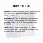 Shampoo: Wet hair thoroughly, apply a small amount of Pro Liss Extreme Shampoo, and lather. Rinse and repeat if necessary.